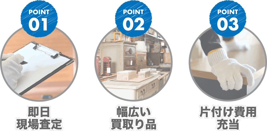 「処分するしかない」と思っていた不要品も、実は価値があるものかもしれません。回収と同時に買取りを行うことで、片付け費用を抑えながら、幅広い品物に対応できるのが強みです。